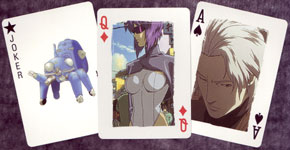 and are clear and easy to read, whilst the box itself carries a great sketch of Kusanagi and Togusa. As a pack of cards they’re fine but as licensed merchandise they are sadly a bit lacking. The main problem is the images used on the cards. All of them are screenshots from the series and whilst there has been some thought given to their arrangement it could have been done better. It would have been nice if the suits were themed to certain groups of characters or episodes, but instead the odd |