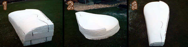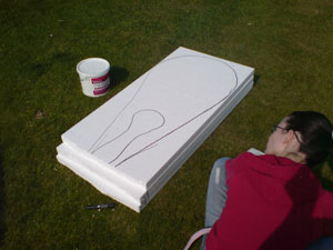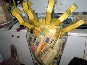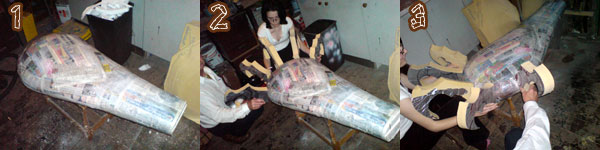 "You need to cut cut slots in to the arm where you want the claws to be, I had other people hold them in place while I had a look to see if I was happy with the positioning or not. With the claws still held in position I then drew round them on the the arm and cut out the sections for them to sit in to with a Stanley Knife. I then coated the whole arm, including claws in position, with PVA and covered it with newspaper (1-3, above). This must be done as fibreglass resin corrodes polystyrene, so 2-3 layers will be needed. Layer them up adding more coats of PVA if necessary and make sure there are no gaps. Once this is dry you're ready to fibreglass."