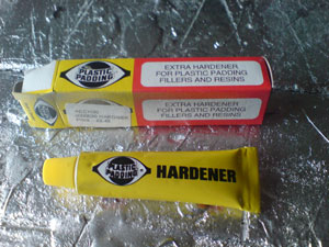 "By now you should have the arm looking nice and all covered in newspaper with no polystyrene showing. Once you have your safety equipment I'd recommend mixing your resin. If you are using the good hardener pictured (see above) you need to mix 8cm with 50ml of resin, I would recommend a weaker mix to begin with - maybe 6cm to 50ml - to give you more time for the hardener to set (you also may need to adjust the mix according to the temperature outside, if it's cold increase it, if it's hot decrease it). Ensure you mix the hardener in well with the resin, you may feel heat coming from the pot but that's just the reaction happening :P "For the next part you may want a helper (also in safety gear), I also recommend wearing old clothes. To use the fibreglass you first need to use scissors to cut the fibreglass cloth to the size of the section you wish to cover (I always cut a little bigger in case). Starting with the claws and surround, paint the part you want to cover with the resin mix then lay the fibreglass cloth on to the painted section. Then paint more mixed resin on to the cloth ensuring there are no bubbles and that there are no dry areas of cloth. Allow to dry (10 - 15 mins if mixed correctly), and once dry trim off the excess cloth. You need to repeat this process on each claw until every claw is covered."