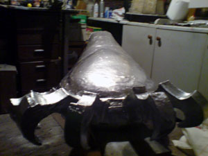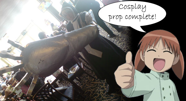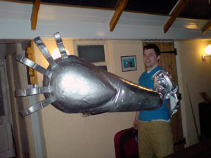 "The first fixture will be your handle, you need to have a handle within the arm so that the cover isn't taking all of the strain. You need to cut away a section where you will insert your arm, I used a saw for this. Only cut as deep as just past the centre of the arm then remove the section you have just cut. You will also need to also scoop out some polystyrene from either side as you're about to insert the dowel which will be your handle. You need to cut the broom handle / dowel to the width of the Arm you then just need to insert it and screw in both ends of it from the outside. "The second fixtures will be straps. You'll need to crack out your sewing machine for this and sew a loop of your webbing around the webbing / strapping. You then need to cut two holes parallel in the Arm either side of where your fore arm will be (ie. along side the walls of your cut out section). You just need to then feed the webbing through leaving the buckle on the inside of the arm. You'll need to repeat this further down the arm as well... "To make the whole thing more comfortable cut some