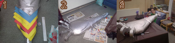 "When the paint was dry I pinned the strips to the arm and when I was happy with the positioning I painted one side with Laytex and pinned them down again (pic 2). Once the sleeve is complete and in place you just need to add the stick on velcro in place on the arm and sleeve to hold the sleeve on to the arm (pic 3)."